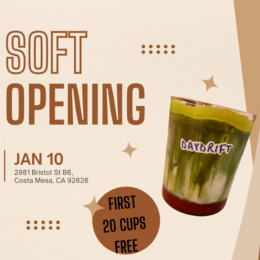 Jan. 10. A new daily obsession is ready for you as Day Drift Coffee is set to open its doors this weekend at The CAMP in Costa Mesa. This soft opening event is set to be a great first introduction for guests. The first 20 cups will be totally free. The first 50 people will also receive marshmallow cookie. Buy one, get one all day as well. Saturday, 8 a.m.-10 p.m. 2981 Bristol St B6, Costa Mesa. More Information